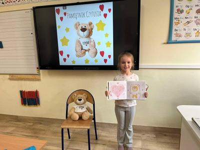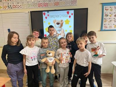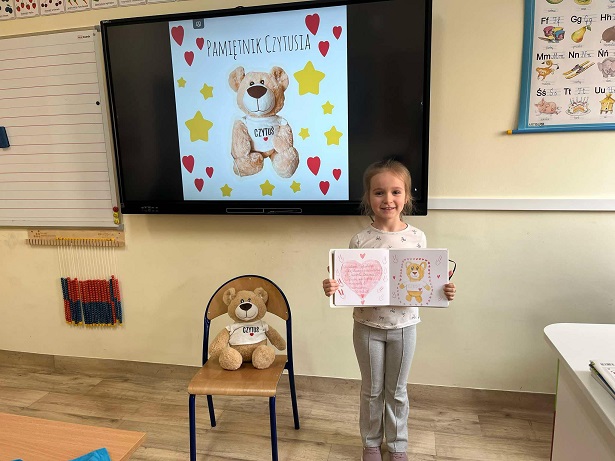 W klasie 1B pojawił się wyjątkowy gość – Czytuś- sympatyczny miś, który uwielbia słuchać, jak dzieci czytają. Przywędrował do nas wraz ze swoim „Czytusiowym Pamiętnikiem”, w którym uczniowie zapisują i ilustrują przeczytane historie. Każdego dnia jeden uczeń losuje Czytusia i zabiera go do domu.
