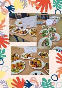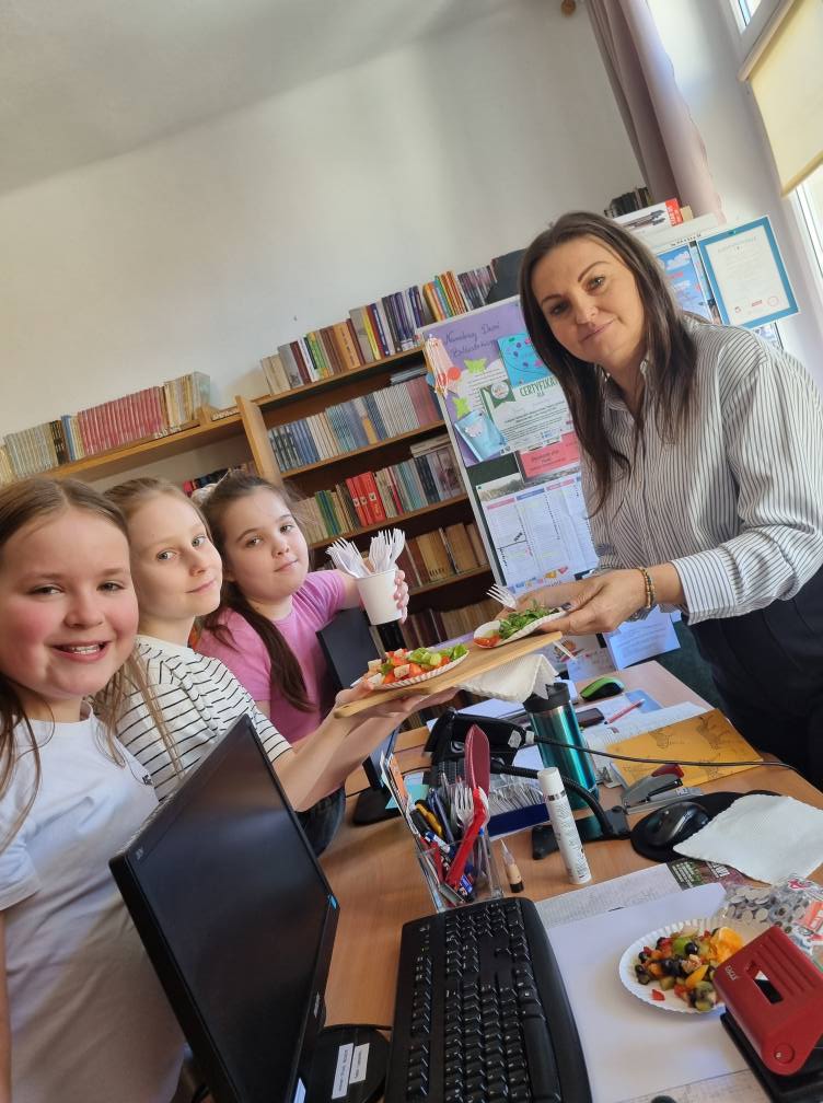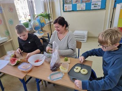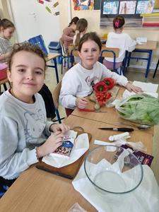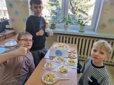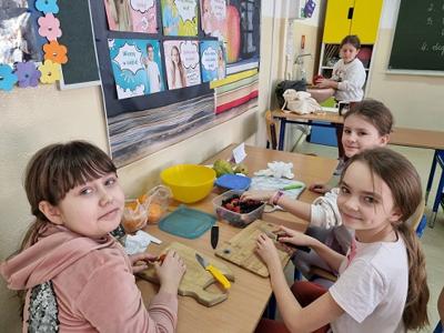 W czwartek 6 marca w klasie 3 na lekcjach edukacji technicznej uczniowie wzięli udział w zajęciach kulinarnych. Zadanie nie polegało wyłącznie na wykonaniu sałatki, natomiast uczniowie w swoich grupach mieli zadanie opracować skład swojej zdrowej sałatki z owoców lub warzyw oraz wymyśleć jej ciekawą nazwę. Tak oto jednego dnia powstał samodzielnie opracowany przepis wraz ze składnikami, a w kolejnym dniu uczniowie działali już praktycznie. Powstały sałatki owocowe i warzywne o nazwach np." Owocowy raj", " Zielona wiosenka", "Owocowa drużyn", inne ciekawe nazwy. Zajęcia były bardzo ciekawe a jednocześnie inspirujące i integrujące klasę.