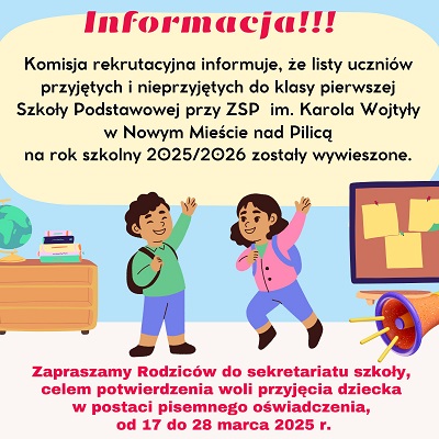Informacja Galeria zdjęć Powiązane wiadomości Rekrutacja do Przedszkola Samorządowego Wilczym Tropem - VI Edycja Miedzynarodowy Konkurs Plastyczny Informacja Dzień otwarty w Liceum Przyznanie wsparcia finansowego w ramach realizacji... Drukuj Udostępnij Data dodania: 14.03.2025 Wyświetlono: 26 Ogłoszenia