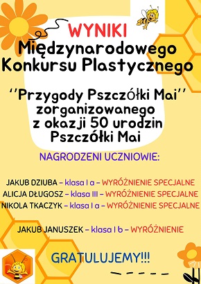 Międzynarodowy Konkurs Plastyczny został zorganizowany z okazji 50 –tych urodzin Pszczółki Mai, adresowany był do dzieci przedszkolnych i uczniów klas I-III SP. Na konkurs wpłynęło 420 prac.