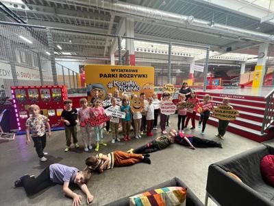 Po części edukacyjnej przyszedł czas na ruch i zabawę! Odwiedziliśmy park trampolin „Kocham skakać”, który okazał się strzałem w dziesiątkę. Dzieci mogły wyszaleć się do woli, skacząc, biegając i korzystając z różnorodnych atrakcji sportowych. Radości i śmiechu nie było końca- energii nie brakowało nikomu!