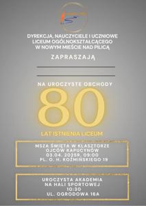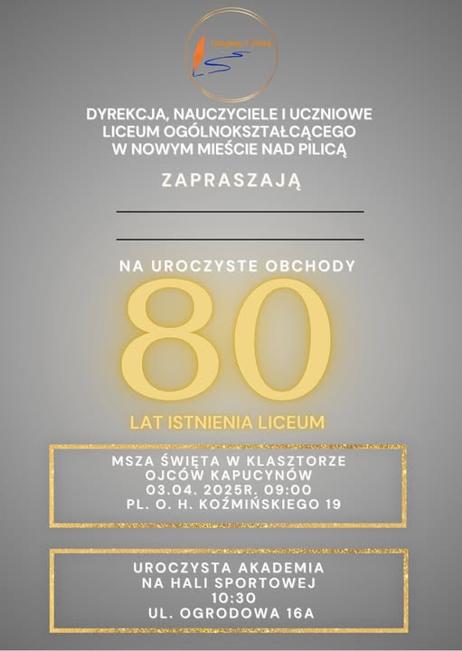 z wielką radością zapraszamy Was na uroczyste obchody 80-lecia Liceum Ogólnokształcącego w Nowym Mieście nad Pilicą, które odbędą się 03.04.2025 r. na hali sportowej o 10.30, ul. Ogrodowa 16A.