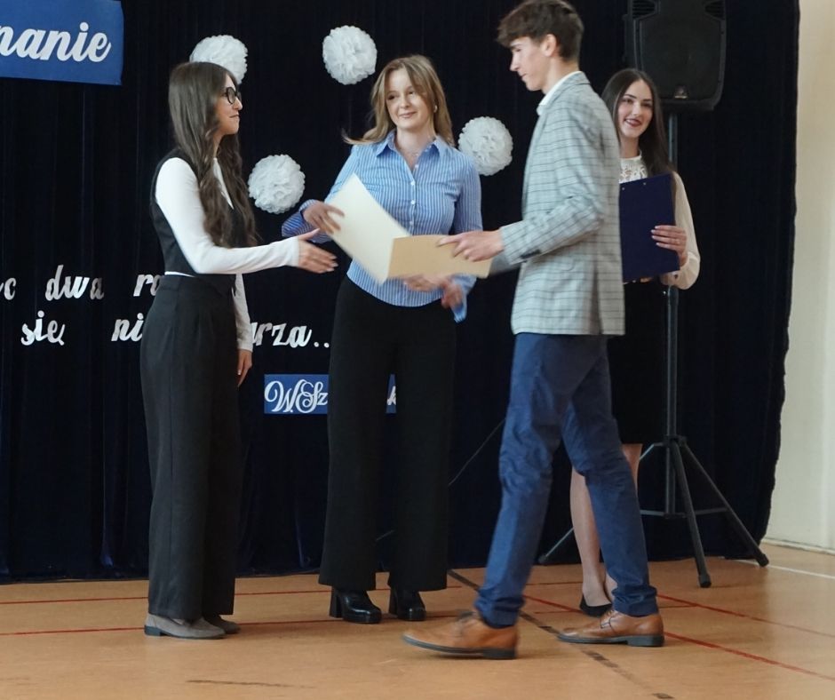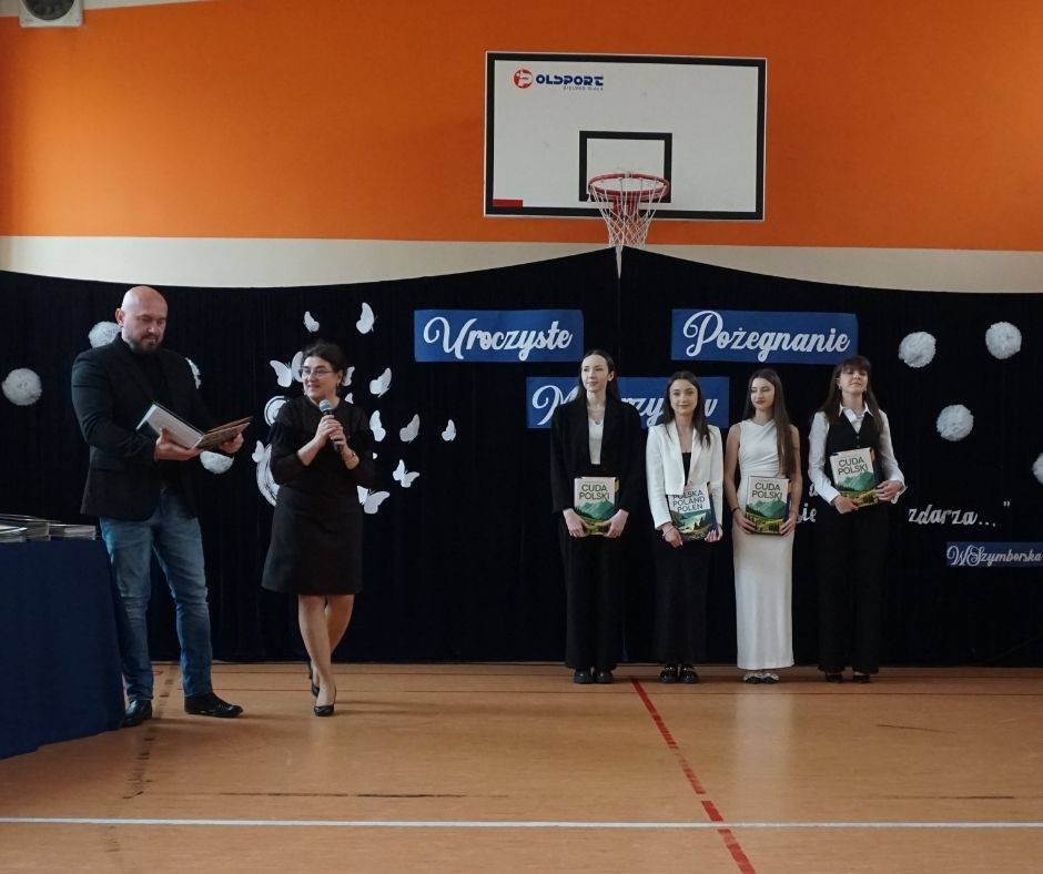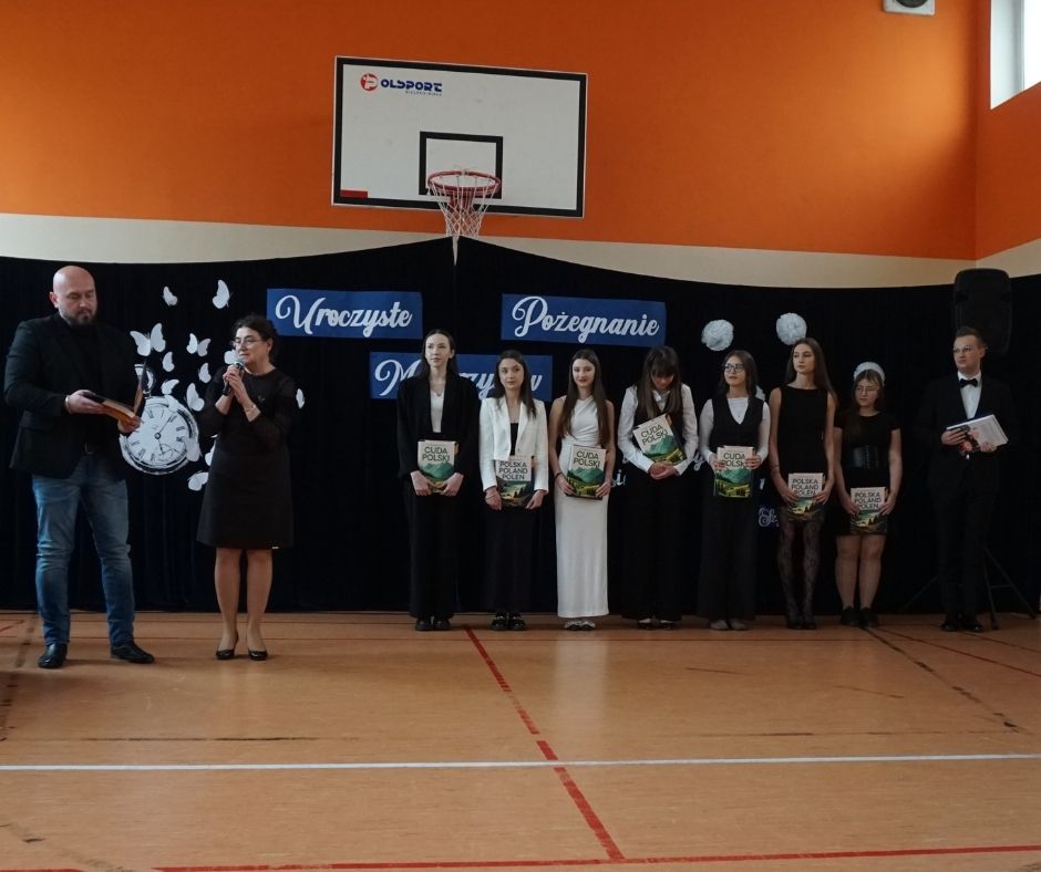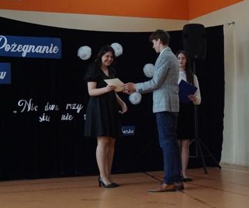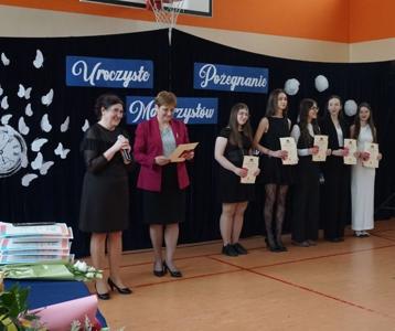 Dzień ten był okazją by docenić naszych uzdolnionych w wielu dziedzinach absolwentów, by wyrazić wdzięczność nauczycielom za wykonaną pracę oraz podsumować działalność młodzieży na polach naukowych, artystycznych, sportowych, społecznych. Na szczególną uwagę zasługują ci, którzy otrzymali nagrody za bardzo dobre wyniki w nauce oraz szczególne osiągnięcia stypendia z rąk Pani Burmistrz Barbary Gąsiorowskiej. Są to: Katarzyna Iwanicka, Małgorzata Grunwald, Jakub Tulin, Oliwia Wiśnik, Justyna Płóciennik, Amelia Strulak, Marlena Dziuba, Aleksandra Zaborska, Wiktoria Kaczmarek, Weronika Paluszewska, Magdalena Lorenc, Marta Czech, Anna Gortatowicz, Amelia Motyl. Ci uczniowie odebrali także nagrody książkowe z rąk pani dyrektor. Nagrodę książkową za wyniki w nauce otrzymała także Aleksandra Gawot.