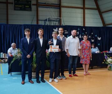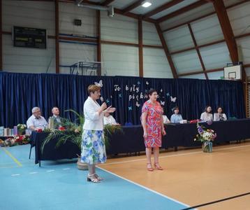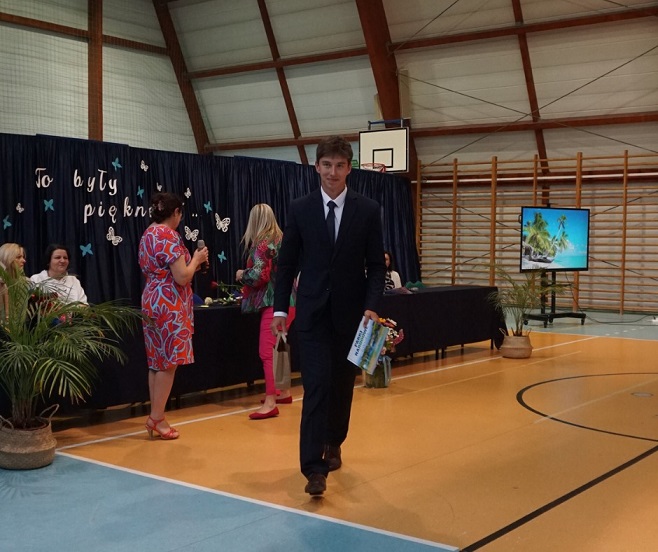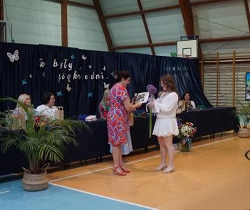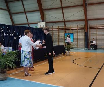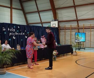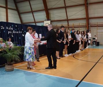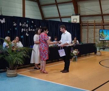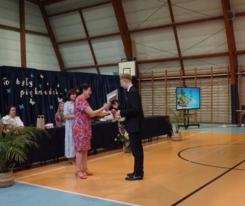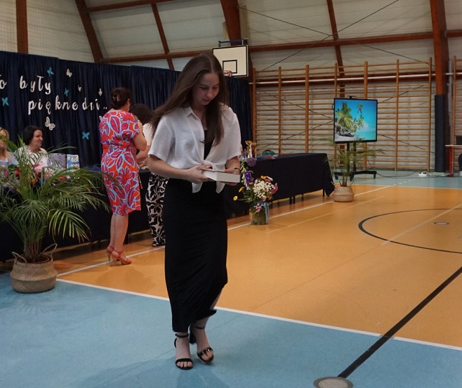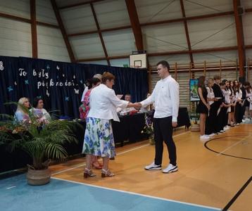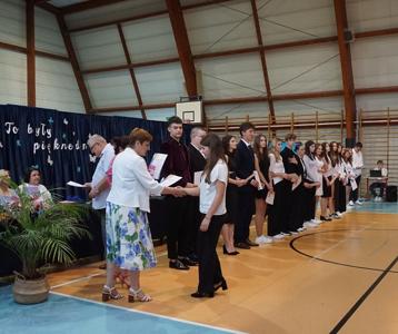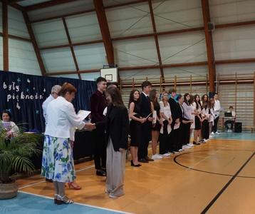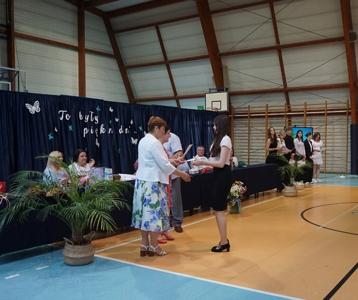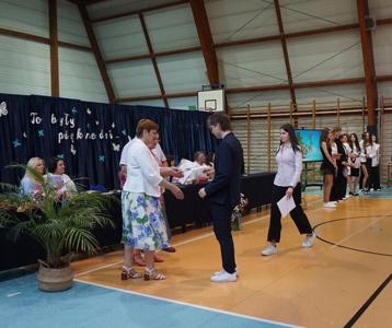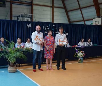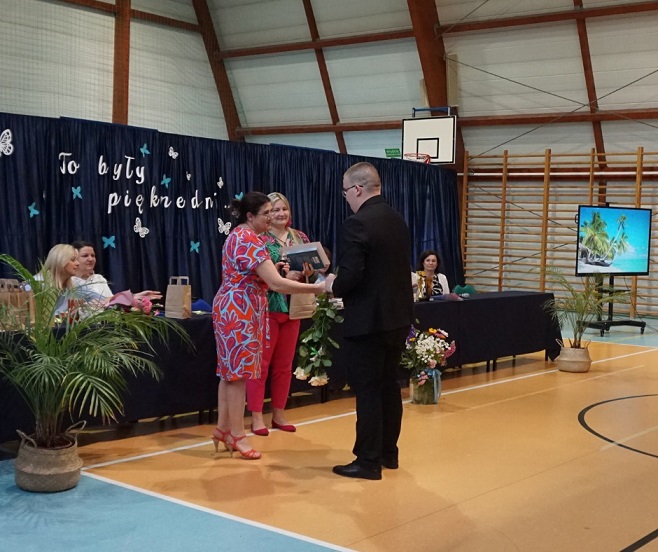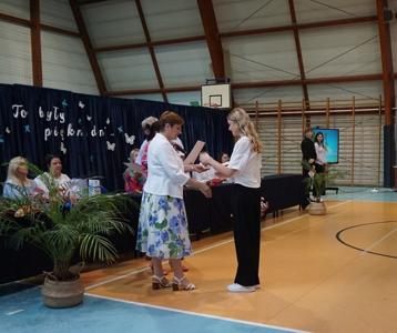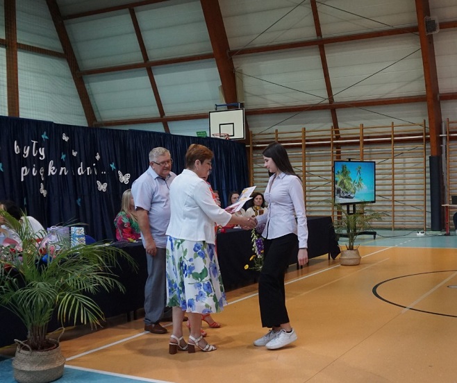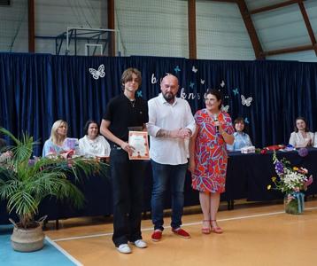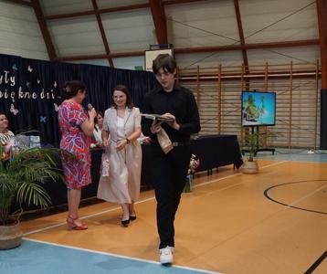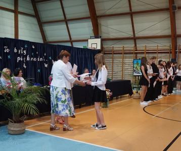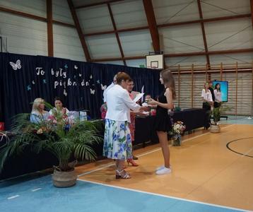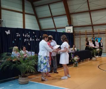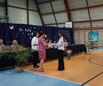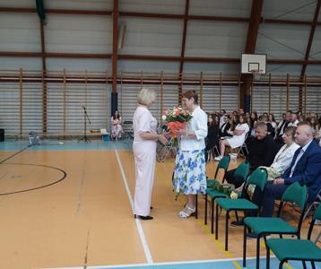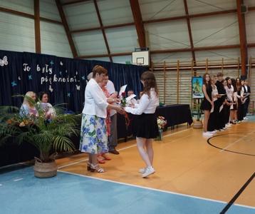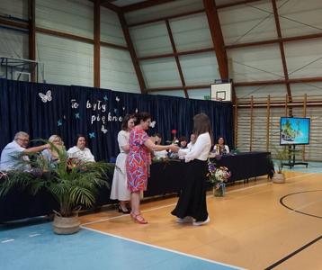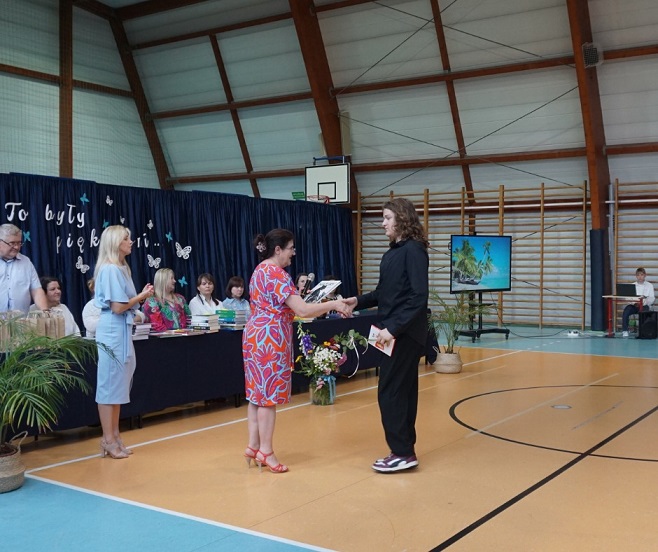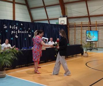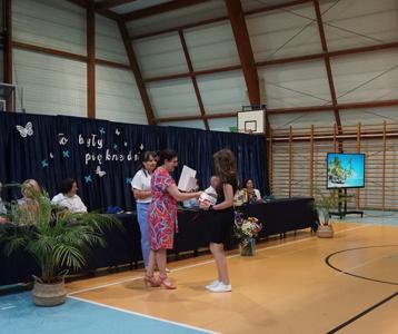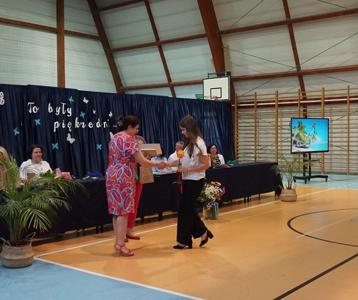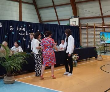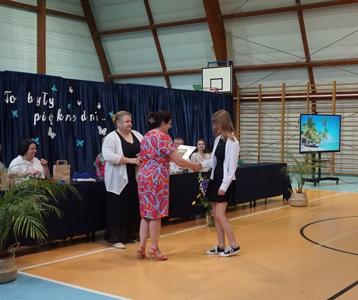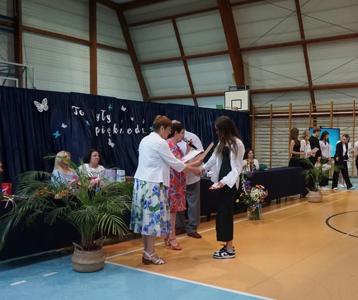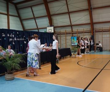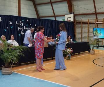 Następnie pani dyrektor Marzanna Olborska wraz z wychowawcami klas oraz panią burmistrz Barbarą Gąsiorowską wręczyły nagrody i dyplomy uczniom za bardzo dobre wyniki w nauce i osiągnięcia sportowe. Rodzice wyróżnionych uczniów otrzymali listy gratulacyjne jako wyraz uznania za wspieranie swoich dzieci w ich edukacyjnej drodze.