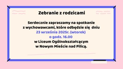 Zebranie z rodzicami Galeria zdjęć Powiązane wiadomości Uroczyste zakończenie roku szkolnego 2024/2025 Uroczyste rozpoczęcie roku szkolnego Narodowe Czytanie Zebranie z rodzicami Warsztaty z Ewą Niespodzianą "O akceptacji, hejcie... Leśny rajd pieszy Drukuj Udostępnij Data dodania: 17.09.2025 Wyświetlono: 6 Liceum Ogólnokształcące